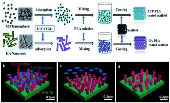 Schematic diagram of the surface modification for porous Ta. Amorphous calcium phosphate (ACP) nanospheres and HA nanorods coating on the surface of Ta scaffold (a). Reprinted from ref. [192]. ZnO nanoslices and ZnO nanorods coating on Ta substrate (b), the ZnO nanoslices will be released at an early stage—within 48 h (c), while the ZnO nanorods are released in a slow pattern over 2 weeks (d). Reprinted with permission from [199]. Copyright © 2021 by American Chemical Society.