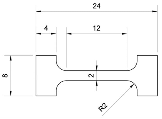 The material was solution treated at 1200 °C for 2 h followed by water quenched immediately and the chemical composition of Inconel 625 alloy used in this work is provided by the manufacturer which is presented in Table 1. Tensile tests were performed on test system SHIMADZU AGX 100 (SHIMADZU CORPORATION, Kyoto, Japan) at two different strain rates, i.e., 5 × 10 −4 s−1 and 5 × 10 −5 s−1, respectively, at room temperature (RT). The micro-specimens for monotonic tensile testing were designed as the micro-plate shape referring to the international standard and previous work [16,18], as shown in Figure 1. Three specimens were tested at each strain rate, and one of the three specimens was interrupted at around 2.0% plastic strain to study the deformation structure.