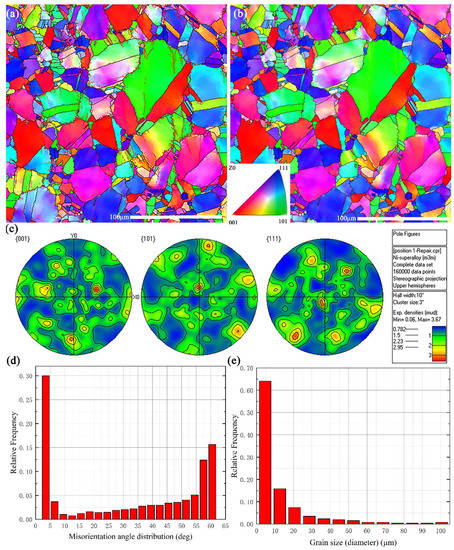 Quantification of microstructure characteristics was achieved by EBSD. Pole figures show that there is no obvious texture in the material and the statistical results show that the sample mainly consists of equiaxed grains and the average grain size is 11.61 µm. The graphic of the frequency of the grain misorientation distribution of the as-received alloy, presented in Figure 2d, exhibits a relatively high fraction of low angle grain boundaries (LAGBs, θ < 15°) [19] caused by the presence of substructures created by a large number of dislocations. These structures can hinder the slip of dislocations explaining to some extent the high tensile strengths of the superalloy [20]. Moreover, a significant level of misorientation about 60 deg indicates an array of twins in the as-received materials [21].