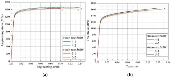 The tensile curves at different strain rates: (a) engineering stress–strain curves, (b) true stress-true strain curves.