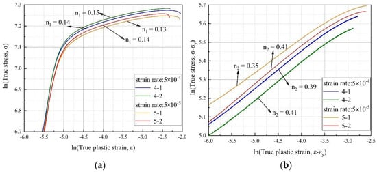 The variations in true stress (σ) with the true strain (ε) and true plastic strain (ε − εY) were, respectively presented as double logarithmic plots in Figure 5. The hardening exponent (n1, n2) is determined as the slope of the corresponding curve, as shown in Table 3. Calculation results of n1 and n2 expose a similar rule that hardening exponent increases with increasing strain rate. This distinctly indicates that the strain hardening stages of the Inconel 625 alloy used in this work are related to the strain rate. It must be pointed out that a much higher growth of n2 at strain rate from 5 × 10−4 s−1 to 5 × 10−5 s−1, fitted by Equation (3) than that of n1 was strongly due to Equation (3) exclusive the impact of elastic deformation stage based on Hook’s law which has no contribution for strain hardening. Accordingly, the index n2 is more sensitive to the strain rate than n1 fitted by the Hollomon equation.