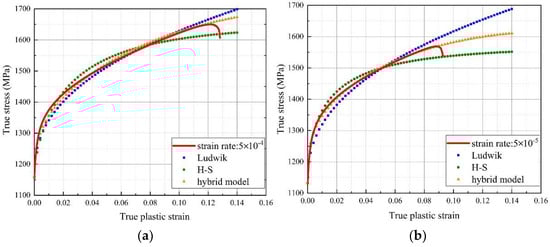 The unsaturated model is represented by classical Hollomon [35] and Ludwik equation [13,36]. The Hollomon model is a typical full-strain model, which describes that the material strength increases in the form of power of constant hardening coefficient (n) during the whole process of deformation. The Ludwik model is an evolution of the Hollomon model with a fixed initial value. The extrapolated stress value of the Hollomon and Ludwik model has no upper limit, and they are written, respectively, as the following:
