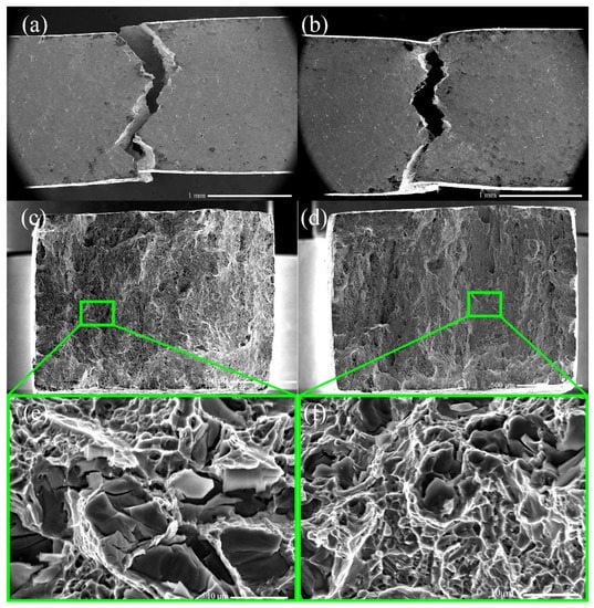 A slight neck can be observed at both strain rates, as shown in Figure 7a,b, which indicates that local plasticity presents before final failure. There is a flat fracture surface with river patterns and fine and shallow dimples on the fracture surface at 5 × 10−5 s−1 presented in Figure 7d,f, which show ductile fracture mode by the occurrence of dimples on the fracture surface. Comparing to the low strain rate, a large number of transgranular cracks can be observed from the specimens destroyed under 5 × 10−4 s−1 in Figure 7c. However, the tensile fracture of high strain rate is mixed mode of fracture though the failure was predominantly intercrystalline. It should also be indicated that the dimple size increases with the increasement of the strain rate.