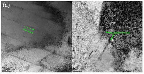 To study the deformation mechanism and dislocation configuration, the TEM images of interrupted tensile tests (2.0% plastic strain excluding elastic strain) as shown in Figure 8 and are gathered for the following analysis. All the deformed samples show planar slip with high dislocation density. Some specific slip bands (Figure 8a) consisted of dislocation structure of densely packed primary and secondary dislocations was observed in the gauge length [38,39]. A few nano deformation twins are occasionally observed in several grains [40] at 5 × 10−4 s−1 without 5 × 10−5 s−1, see Figure 8b Generally, in face-centered cubic (FCC), twinning is facilitated through lower stacking fault energy (SFE) and special deformation conditions (such as low deformation temperatures or high strain rates) [41,42]. For Inconel 625, as an FCC metal with low SFE, the deformation mechanism is twinning ({111}<112>) and dislocation slip ({111}<110>) through the tensile deformation modes [43]. Therefore, slip is the main deformation mode during the initial stages of tensile deformation under both strain rates. After dislocation multiplication and tangle formation, further deformation results in dislocation cross slip being suppressed to that extent the cross slip of Shockley partial dislocations could lead to intrinsic stacking faults on parallel {111} planes, leading to twins [44]. Thus, twinning is the other deformation mode during the futher stages of tensile deformation, and twin boundaries act as strong obstacles to the dislocation motion, resulting in improvement of alloy strength [45,46]. Li et al. [47] has also found the deformation twins in other alloys, and demonstrate that this critical change of deformation mechanisms from dislocation slips to twinning behavior is responsible for such an increasing of hardening exponent (n) value from 5 × 10−5 s−1 to 5 × 10−4 s−1. This is consistent with our experimental results.