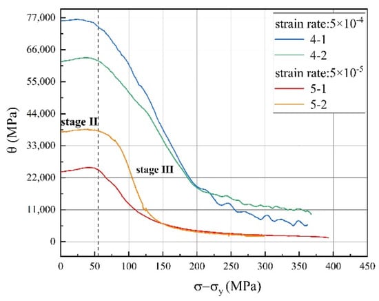 However, the average values of intersection number determined from the TEM micrographs of tensile specimens strained at 5 × 10−4 s−1 was relatively higher than the low stain rate ones 5 × 10−5 s−1. This can also be verified by examining the TEM micrographs presented in Figure 11, showing the denser population of dislocations at this strain rate. Essrntially, the number and velocity of dislocations are improved at a high strain rate, which accompanied with the increasing of the dislocation density per unit area. Accordingly, the high initial dislocation density in the high strain rate specimens might have contributed to the initial high and nearly constant strain hardening rate (i.e., stage II linear hardening shown in Figure 10 of the specimens under 5 × 10−5 s−1. This suggests that much higher activation energy is required for the plastic flow due to powerful barriers to the dislocation movement [54]. As described by reference [12], a positive work hardening stage II occurs due to continuous reduction in mean free path during dislocation–dislocation interaction and dislocation pileups at the grain boundary. Thus, the Taylor dislocation contribution σd = MαGbρ1/2 in Equation (7) dominates this region. The increasing of the number of dislocations leads to the increasing of the resistance to the dislocation movement, and the stress required to deform the materials becomes higher with increasing deformation. This is in accordance with Zhang’s results in nickel-based superalloy [16].