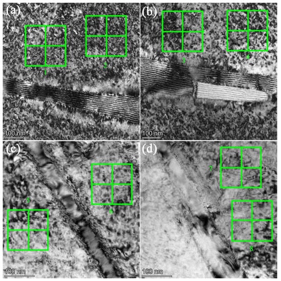 The applied stress necessary to deformation is obviously proportional to the dislocation density in the material. Thus far, dislocation density is affirmed necessary in this investigation. The magnitude ρ was determined by the line intersection method [51,52,53] based on the superimposition of a grid consisting of horizontal and vertical test lines on the TEM micrographs that contained dislocations of the specimens at both strain rates. Since here we only need to compare the different influence between the two strain rates qualitatively, we can briefly distinguish the dislocation density of different strain rates by computing the average number of intersections of each test lines with dislocations. To simplify the computing process further, the grid was drawn as a square, as illustrated in Figure 12. For each strain rate, two pictures were used, and for each picture, we grid two areas that unaffected by the precipitate, then the computing results are listed in Table 6.