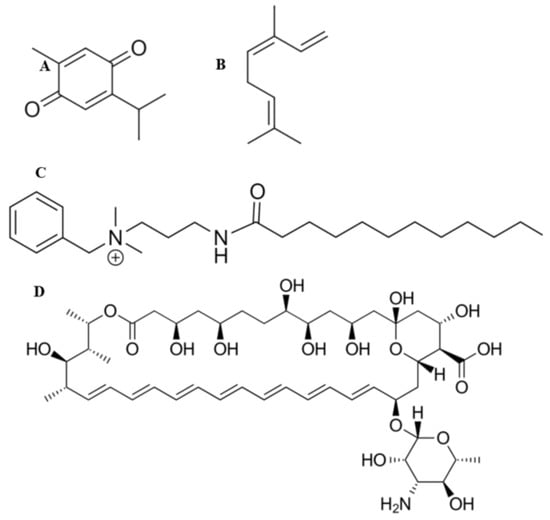 Chemical structures of thymoquinone (A), ocimene (B), miramistin (C), and amphotericin B (D).