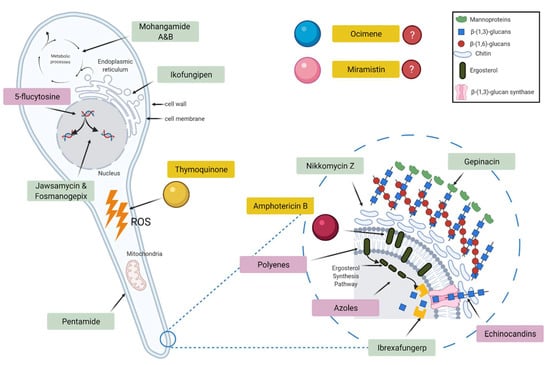 Schematic diagram showing the target sites of currently used antifungal drugs (pink), pipeline antifungals (green), and the test drugs used in this study (yellow).