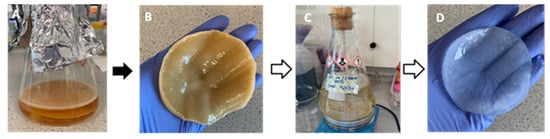 Biosynthesis of bacterial cellulose in Hestrin and Schramm medium, including pre- and post-purification. (A) static biosynthesis of BC which can be seen floating on top of the medium, (B) unpurified BC post harvest, (C) purification of BC in 2% (w/v) sodium hydroxide and, (D) purified BC.