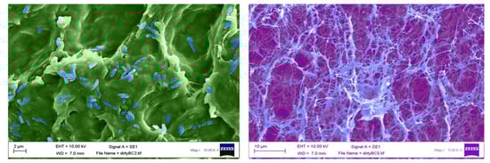 After biosynthesis, both unpurified and purified BC were lyophilised for 96 h and analysed using a scanning electron microscope. Figure 4A shows an unpurified sample of BC, which has been false coloured to highlight the closed matrix as it is laden with growth media and biomass, the bacteria, G. xylinus, can be seen highlighted in blue. Figure 4B shows an SEM micrograph of purified BC, and the nanofibrous matrix is now visible (blue) with typical voids (purple) also present.
