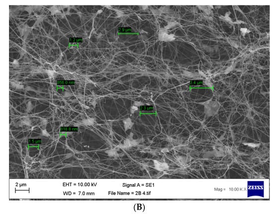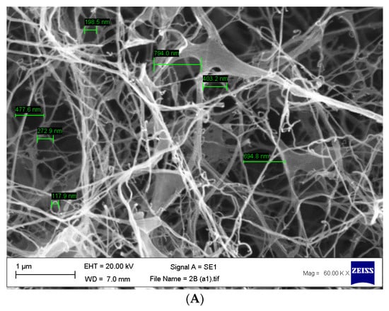 Once the bacterial cellulose was purified and lyophilised, SEM analysis was undertaken to confirm the pore size. Our results are concordant with previously published data [51], which show an average pore size of 117.9 nm to 3.4 µm (Figure 5A,B).