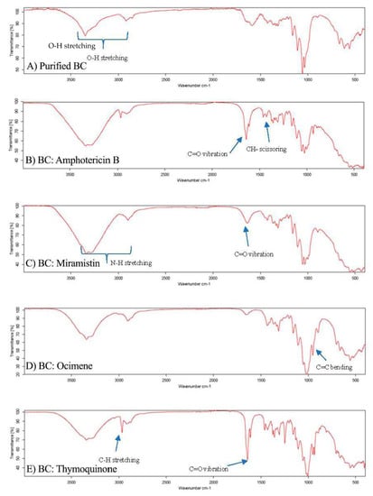 FTIR spectrographs of (A) purified BC, (B) BC: Amphotericin B, (C) BC: Miramistin, (D) BC: Ocimene, and (E) BC: Thymoquinone. (n = 3, 16 scans).