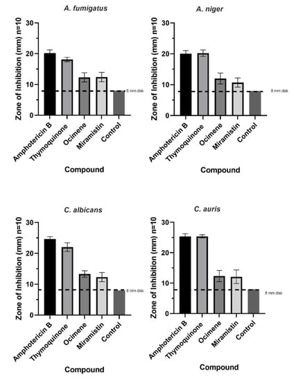 After successfully loading the drug compounds, we proceeded to conduct MIC90 and MFC studies to determine the optimum concentration to apply in disk diffusion and cytotoxicity assays. All MIC90 results (Table 3) obtained in this study are consistent with published MIC90 breakpoints where available in CLSI M60 and M61 standardised protocols [57,58]. This suggests that the test compounds have similar antifungal properties to amphotericin B, but on average, they are 69% less cytotoxic while maintaining similar antifungal profiles. This could prove beneficial in treating resistant and difficult to treat fungal infections, as compounds such as thymoquinone or ocimene, which appear to have similar antifungal profiles to amphotericin B, could be given without the harsh side effects that are often observed when administering amphotericin B.