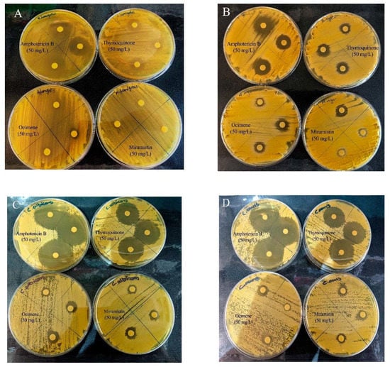 Representative disk diffusion assay plates showing the ZOI of bacterial cellulose disks loaded with amphotericin B, thymoquinone, ocimene, and miramistin against (A) A. fumigatus, (B) A. niger, (C) C. albicans, and (D) C. auris (n = 3).