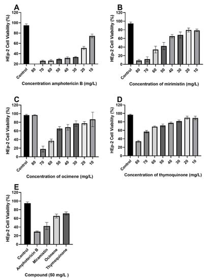 MTT cytotoxicity assay with varying concentrations of each respective drug, (A) amphotericin B, (B) miramistin, (C) ocimene, and (D) thymoquinone, against HEp-2 cells, (E) condenses data of 50 mg/L drug concentration from each graph (A–D) for ease of comparison. All tests were carried out in triplicate. Control was DMSO and RPMI-1640 (50:50) (p ≤ 0.01, n = 10, error bars = SD).