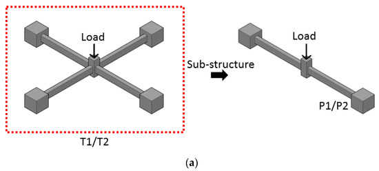 The prototype structure is a 4 × 4 panels, single-story frame. This is the same frame studied by Qian et al. [24]. However, in this study, the substructures with 2 × 2 panels excluding RC slabs were chosen for simplification. The selection of the simplified subassembly in this case is mainly to help focus on CAA and TCA. Usually, this type of substructure with at least two spans allows those actions to develop. Therefore, two types of specimen labeled as T- and P- were fabricated. The details of dimension and reinforcement are summarized in Table 1. Herein, T1 and T2 are the three-dimensional beam-column structures with different combinations of beams, in which P1 and P2 can be considered as the longitudinal and transverse beam of T1, respectively. The differences between T1 and T2 specimens are shown in Table 1, which shows the cross-sectional dimension and span of the beam.