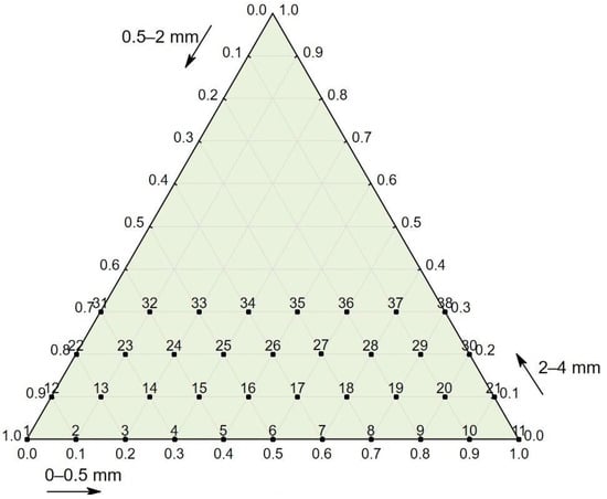 Plan of the experiment: percentage of three aggregate fractions: 0–0.5 mm, 0.5–2 mm, and 2–4 mm for 38 types of tested concrete mixes.