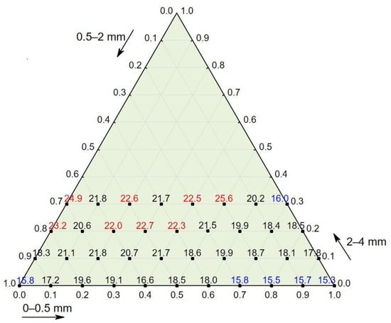 The aggregate fractions 0–0.5 mm and 0.5–2 mm were assessed within a scale from 0 to 100%, with steps equal to 10%, and the fraction 2–4 mm was assessed within a scale from 0 to 30%, with the same steps (see Figure 1). The water-to-cement ratio was constant and equal to 0.53 for all 38 mixes. All of the components were mixed in a concrete mixer for 2 min starting from the moment the dosing process of the ingredients ended. During molding, the concrete was compacted for 1.5 min using a vibration table characterized by 50 Hz frequency. The concrete specimens were in the form of cubes that were 150 × 150 × 150 mm. Afterward, the specimens were cured for 28 days in laboratory conditions at a temperature of +20 °C and a relative humidity of over 90%.