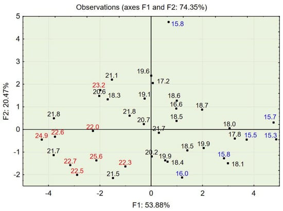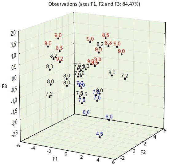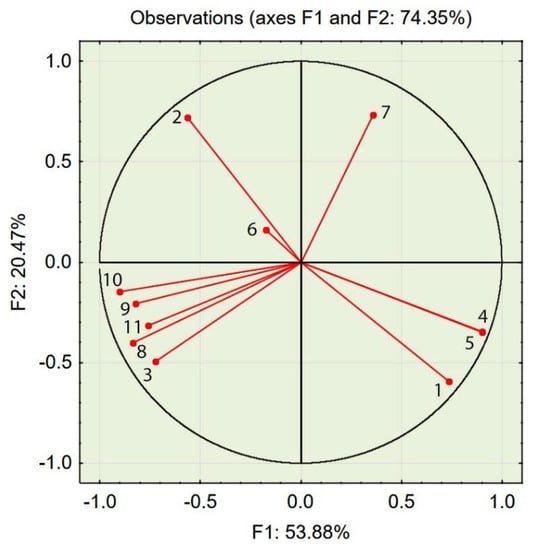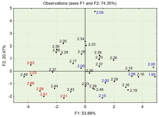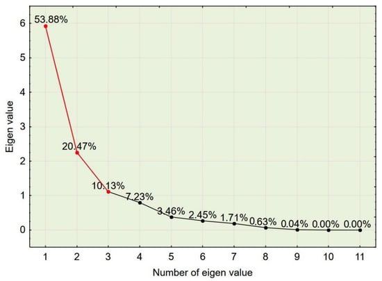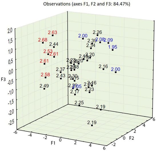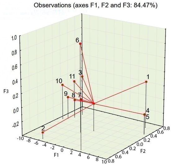 In order to determine the number of factors used in PCA [38], a scree plot of eigenvalues was constructed. One can see that the “elbow” of the graph where the eigenvalues appear to level off is found at eigenvalue 3, which means that factors to the left of this point should be retained as they are significant. The first two factors explain 74.35% of the variance, while the first three factors explain 84.47% of the variance (see Figure 4). Two or three factors can be visualized in 2D or 3D plots.