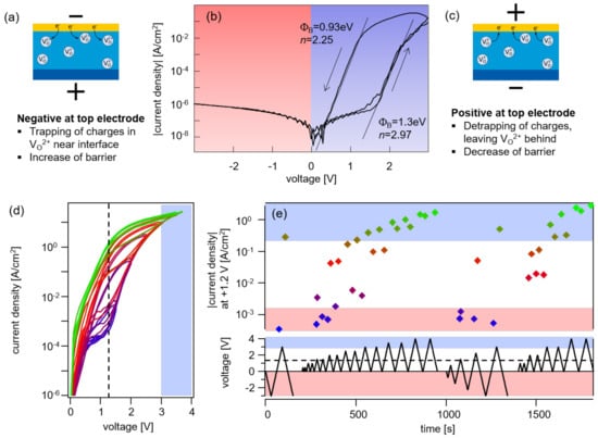 Current-voltage behaviour of AZO/ZnO:Ar/ZnO:O/RuO layer structures. The sign of voltage refers to the polarity at the top contact. A typical IV curve obtained by cycling the voltage between and V is shown in (b). The indicated barrier heights, , and diode quality factors, n, were extracted from the 0 V intercept and the slope of the linear parts of the curves. The forward biased current obtained with a stepwise increasing voltage is shown in (d). The corresponding sequence of voltage for the curves shown in (d) and additional sequences are shown together with the extracted current densities at V (dashed lines) in (e). The proposed model to explain the switching behaviour is shown in (a,c).