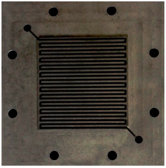 More realistic arrangements and operations of a fuel cell are reflected by the so-called single cell tests or fuel cell tests, in which a functional model cell or multi-cell connection is constructed in which the individual cells operate simultaneously under the same conditions [27]. Individual components for assembling a fuel cell include bipolar plates with a formed channel system, MEA, metal collectors, and endplates. Bipolar plates are most often tested with a “serpentine flow field” design [26,52,53,54,55,56]. An assembled cell of a commercial MEA, carbon fabric, and bipolar plates with single serpentine flow fields, clamped between two endplates, is shown in Figure 2 [26].