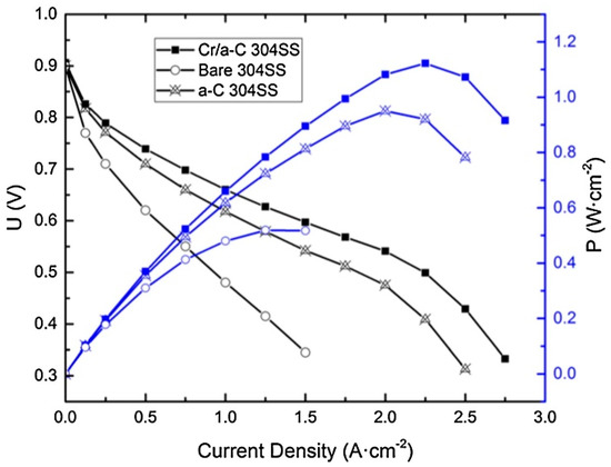 The systems with a combination of a carbon layer and a nitride-based layer are also being studied. Adding nitrogen into an amorphous carbon layer on AISI 316L, using CFUMBSIP, improves its corrosion and conductive properties, resulting in achieving the DOE targets. The compactness of the protective layer also benefits from the formation of a CNx phase. The corrosion current density was 10–40 µA∙cm−2 at 1.6 V/SHE. Operating at high voltages could be a problem and should attract more attention in future research [126]. Cr/N co-doping of diamond-like carbon on AISI 316L resulted in a smoother surface with better electrical conductivity, compared to doping only with nitrogen. Cr positively affected the ratio of conducting bonds, and coating with 6.67% Cr showed the best results [127]. Multilayer systems may provide improved resistance if low deposition rates are applied by means of CFUBMSIP [81]. Depending on the duration of the exposure, layers with a high proportion of sp2 bonds and an amorphous structure were prepared using this method. The combination of nitride and sp2 bonds achieved a contact resistance value in the range of 2.6–2.9 mΩcm2 at 150 N∙m−2 depending on the layer thickness. These values were lower than those of a pure carbon coating and even lower than those for gold-plated steel. However, it is not clear from the article [81] when the contact resistance was measured; the corrosion tests themselves were rather short-term in nature and did not fully correspond to DOE parameters (e.g., 10 h of potentiostatic test). Chromium was used as an adhesive interlayer for the deposition of TiN [48]. The properties of this system were compared with a single-layer system and thin layer of gold. After a short-term test, the multilayer system and the 10 nm gold layer met the DOE 2020 limits.