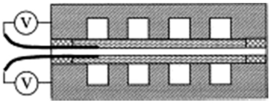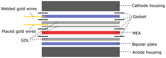 Interfacial contact resistance (ICR) or specific contact resistance is defined as the total resistance of an interfacial layer induced by a current passing through layers [62]. The contact resistance between the bipolar plate and the diffusion layer can be measured both in situ and ex situ, in principle. The latter is a simple and quick measurement to determine an approximate value, while in situ measurement offers more accurate readings when operating individual cells or connecting them in a series to a larger unit [63]. One in situ measurement variant consists of inserting a thin gold wire into an MEA during manufacture (Figure 4) and subsequently measuring the voltage drop between the wire and the bipolar plate during fuel cell operation (Figure 5) and the resistance calculated from it [64]. The more complicated arrangement consists of placing the gold wire in two places. The first is located between the GLD and the cathodic bipolar plate to which it is welded, the second is between two GLDs (Figure 6). The voltage is measured between the GLDs and the ICR is calculated from it. However, measurements are only made at the cathodic site, since measurement at both the cathodic and anodic sides is very difficult in this arrangement [65].
