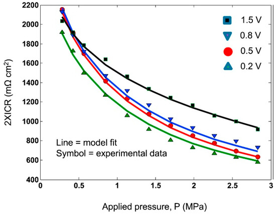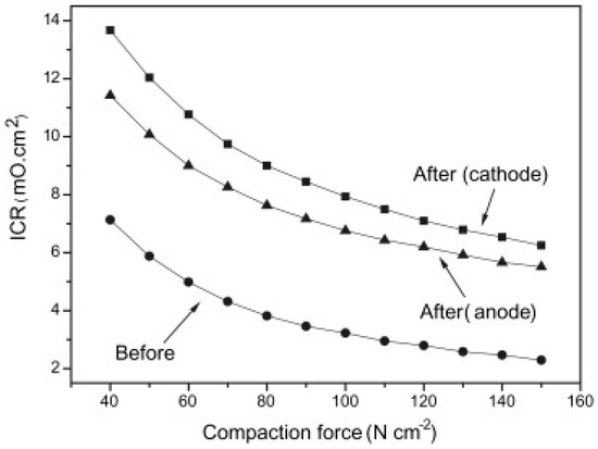 A typical representation of the contact resistance measurement is the dependence of ICR on the amount of contact force (Figure 8). As the contact resistance depends on the conduction contact diameter, the magnitude of the compaction force affects the contact surface and indirectly interfacial contact resistance as well [50]. Therefore, a pressure of 140 N/cm2, corresponding to the mechanical load in the practical fuel cell stack [48], was chosen within the DOE limits to compare different results. The surface area and hence the contact resistance can also be affected by surface roughness. The properties of a passive layer, such as its corrosion resistance, surface conductivity, or composition and thickness, are other parameters that may translate into ICR values [35,50]. In order to correctly evaluate the resistance properties of a material, it is necessary to measure contact resistances, not only at the beginning of the exposure, but also during short and long-term tests [67,71], because the characteristics of passive layer might change during tests [72].