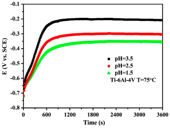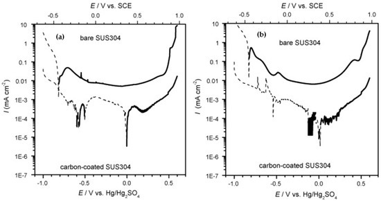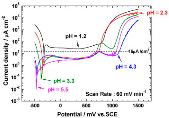 Inconsistency in the choice of the electrolyte may be related to the differently reported aggressiveness of the fuel cell environment in the literature. In studies, it is possible to find information on the pH of a fuel cell environment in the pH ranges of 3–6 [34], 2–3 [1,36,37,38], 2–4 [30], or 3–5, depending on the extent of membrane degradation and hydrolysis of metals released from the bipolar plate [27]. Frequently, there are low pH values reported for the catalyst layer and Nafion membrane (a commercial name for copolymer of tetrafluorethylene and the perfluorovinyl ether with sulfonyl fluoride terminal groups). However, these are not directly in contact with the bipolar plate, and these values of pH might be inaccurate; moreover, it may be different for the anode and cathode [10,27]. Increasingly, under the influence of pH testing of the fuel cell environment, and under the influence of the DOE requirements, less concentrated solutions with a higher pH are tested, such as sulfuric acid with a pH = 3 [27]. Some authors also recommend a higher pH, e.g., Rajael simulated cathodic conditions with an electrolyte of pH = 5 for the reason that, at the beginning of fuel cell operation the pH = 2–4, but after a while, it will increase to 6–7 [39].