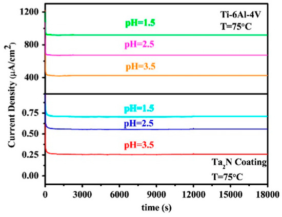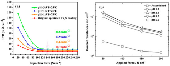 A multilayer Ta/TaN system prepared by magnetron sputtering produced a defect-free and adhesive coating that exhibited corrosion behavior below the DOE threshold (0.028 µA∙cm−2) [90]. Although the ICR results did not meet the DOE 2020 limits, the values remained stable after a 12-h potentiostatic test and only slightly exceeded this limit (13 mΩcm2 after the corrosion test). Amorphous Al-25Cr-5Mo-40N with a content of nitrides (AlN, MoN, CrN, CrN2) and oxides (Al2O3, MoO2) was comparable, considering corrosion resistance, with Ta/TaN on AISI 316L. However, the ICR (around 33 mΩcm2) did not meet the DOE targets [102].
