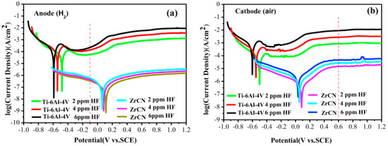 A variety of published studies are on the exposure conditions of the monitored materials—especially the temperature, composition, and pH of the electrolyte. Corrosion media can be divided into two groups—test solutions simulating fuel cell conditions and solutions for accelerated tests [34]. Simulated solutions contain fewer anions with a pH closer to that of fuel cell operation and are more representative of actual conditions [34]. Their compositions are based on electrolyte analyses (ICP-AES, ICP-MS) after long-term operation of model fuel cells [16,28], and this corresponds to low-molar sulfuric and hydrochloric acid solutions with added fluoride ions, e.g., 12.5 ppm H2SO4 + 1.8 ppm HF or 0.01 mol∙L−1 HCl + 0.01 mol∙L−1 Na2SO4 [34]. The corrosive environment for accelerated testing has a much more acidic character, corresponding to different concentrations of sulfuric acid, with or without fluoride ions. Often the chosen medium is 0.5 mol∙L−1 or 1 mol∙L−1 sulfuric acid with 2 ppm HF [34].