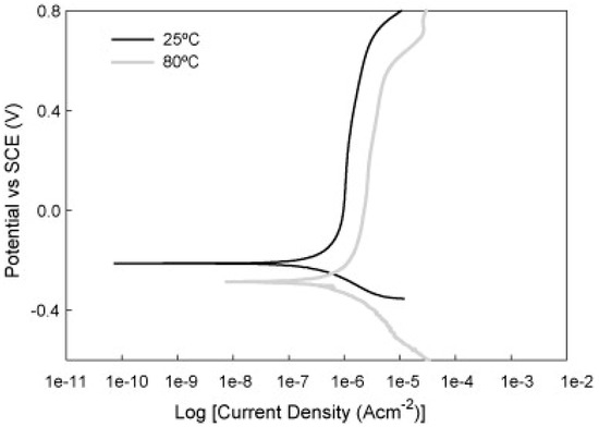 Inconsistent testing conditions are also supported by the choice of temperature. Although authors consistently report that fuel cell operation is associated with elevated temperatures of around 70–80 °C, many of them perform simulations only at laboratory temperatures [40,41,42,43,44]. The choice of temperature can, in principle, affect the course of the corrosion process; while at room temperature, the material can show satisfactory values, at 70 °C its passivation ability and the stability of the passive layer can be reduced or even disappear [45,46].