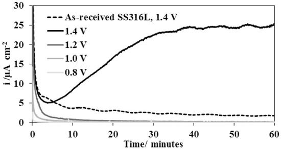 AISI 904L steel outperforms AISI 316L steel, and has a wider passivity range and different passivation current density. This is probably due to a different composition of the passive layer, which is richer in chromium and nickel. However, both materials should avoid exposure to potentials above 1 V vs. SHE under cathodic conditions. Above this potential, steels enter transpassivity and an excessive release of transition metal cations into the environment occurs [16]. This is undesirable in terms of membrane contamination and depletion of the passive layer by chromium, which transfers into the solution as hexavalent ions. The passive layer largely consists of iron oxides, which provide less effective corrosion protection [83].