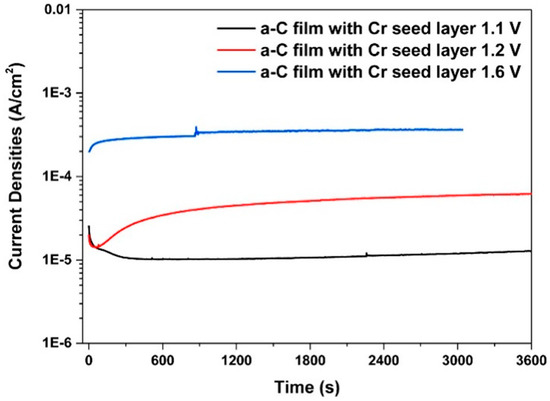 In addition to single element interlayers, combined interlayers, such as Cr + CrC, can be used with amorphous carbon, which exhibits the best properties compared to both chromium and titanium interlayers [79]. At the nanoscale, a structure with a morphology that most effectively blocks defects is created. Furthermore, the hardness and other important mechanical properties increase by the formation of carbides [26,79]. The amorphous carbon coating with a Cr-C interlayer was tested, for example, on 304 steel (Figure 9). Corrosion tests met DOE 2020 limits, and ICR was slightly higher (16.65 mΩcm2 at 150 N∙cm−2) [26].