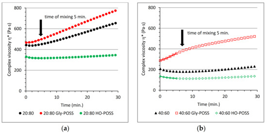 Complex viscosity η* as a function of time at processing temperature 160 °C at constant strain and angular frequency, equivalent of 1 s−1 oscillation strain rate for POSS modified 20:80 PLA/ENR (a) and 40:60 PLA/ENR blend (b).