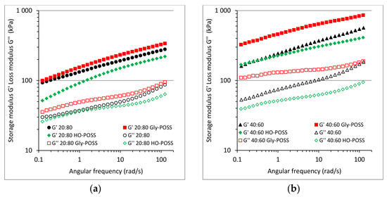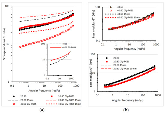 Influence of POSS on the storage shear modulus G’ and loss shear modulus G’’ as a function of angular frequency at 30 °C for 20:80 PLA/ENR (a) and 40:60 PLA/ENR (b) blend.