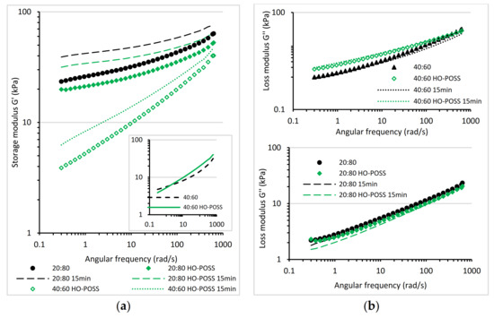 Opposite effect was caused by HO-POSS addition into 20:80 PLA/ENR blend, the values of the storage shear modulus G’ were lower for whole studied angular frequency range (Figure 5). The decrease of G’ modulus after incorporation of HO-POSS to 40:60 PLA/ENR was observed only at the low values of angular frequency, less than 1 rad s−1. At higher frequency, the presence of HO-POSS led to slight increase of storage shear modulus G’ as compared with neat 40:60 PLA/ENR. The compression molding for 15 min at 160 °C caused the increase of storage shear modulus G’ of both 20:80 and 40:60 PLA/ENR/HO-POSS blends but the G’ values were much lower than that observed for neat PLA/ENR blends. HO-POSS did not participated in curing reactions between PLA and ENR phase. Moreover, the presence of HO-POSS slowed the curing reactions during compression molding of the PLA/ENR blend, indicating that HO-POSS prevented the degradation of PLA.