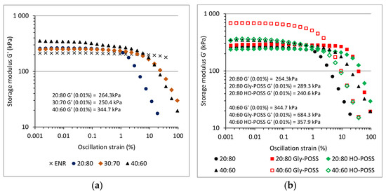 Storage shear modulus G’ as a function of oscillation strain at angular frequency of 10 rad s−1 (1.59 Hz) at 30 °C for ENR/PLA (a) and POSS modified blends (b).