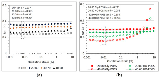 The presence of more rigid PLA caused stronger energy dissipation leading to higher values of loss tan δ for PLA/ENR blends in comparison with neat ENR (Figure 8). As the amount of PLA in ENR/PLA increased the values of loss tan δ decreased. This effect is probably caused by the changes in blend morphology and improvement of interfacial bounding via formation of chemical bonds between functional groups of ENR rubber and end chain groups formed by the chain scission of PLA during processing. At low PLA concentration the dispersed PLA formed separated droplets immersed in elastic ENR matrix. The morphology refrainment to more co-continuous at higher concentration of PLA and improvement of interfacial bounding led to changes in damping properties of the material. Reduction of the loss tan δ was also observed for the 40:60 PLA/ENR and 20:80 PLA/ENR blends modified with both POSS as compared with neat PLA/ENR blend. Although, it should be marked that for the blend with higher amount of incorporated PLA the application of POSS reduced the range of oscillation deformation in which the values of the loss tan δ were linear.