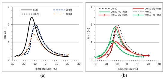 Loss tan δ (−) as a function of temperature (°C) for PLA/ENR (a) and POSS modified blends (b).