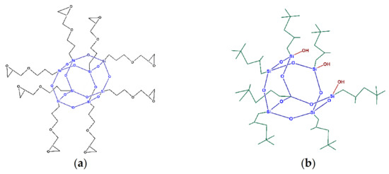 The structures of used polyhedral oligomeric silsesquioxanes POSS additives: (a)—glycidyl-POSS, (b)—trisilanolisooctyl-POSS.