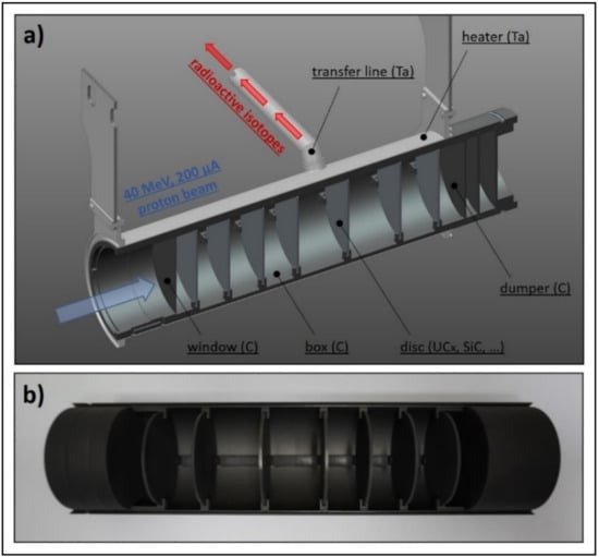 - Ramos, J.P. Thick solid targets for the production and online release of radioisotopes: The importance of the material characteristics—A review. Nucl. Instrum. Methods Phys. Res. Sect. B Beam Interact. Mater. Atoms 2020, 463, 201–210. [Google Scholar] [CrossRef]