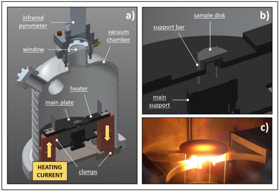 The experimental set-up used to measure the total hemispherical emissivity ε was entirely designed and constructed at LNL. Its main details are illustrated in Figure 4. A dedicated power supply (IMAX = 1000 A, VMAX = 10 V) directly heats by Joule effect the graphite heater, which is connected to water-cooled copper clamps at its extremities. The heater is designed in order to produce on its top circular surface (diameter equal to 18 mm) a homogeneous temperature distribution at temperature levels up to 2200 °C. Four tungsten bars suspend the sample disc coaxially with respect to the round hot surface of the heater. Sample diameters can range from 30 to 40 mm (the thickness is usually between 0.5 and 3 mm), and the bars (inserted in the graphite main support represented in Figure 4) allow for a precise spacing between the sample disc and the hot surface of the heater, with the possibility to make fine regulations between 0.2 and 5 mm. The spacing is an extremely important parameter that deeply affects both the maximum disc temperature (in the center) and the severity of the gradients (in the radial direction). The temperature profile induced in the sample disc indeed reproduces very closely the temperature field {T} related to the proton beam power deposition, characterized by strong radial temperature gradients. As explained in the following paragraphs, these gradients are particularly important for the study of both k and σLIMIT. For the moment, we simply highlight that such an apparatus allows for fine temperature regulations in the center of the disc (see Figure 4c) by setting up the heater–disc spacing and the heating current coming from the power supply.