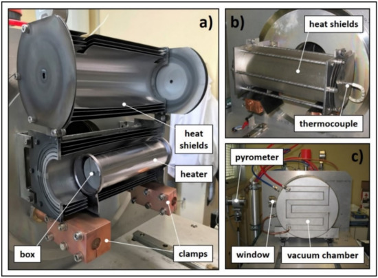 The experimental apparatus used to determine the temperature limit of target materials; (a) picture of the opened hot zone; (b) picture of the closed hot zone; (c) picture of the water-cooled vacuum chamber and of the temperature measurement setup.