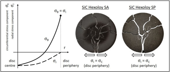 Every disc was accurately positioned and centered on the experimental apparatus illustrated in Figure 4. The induced temperature field {T} proved to be axial-symmetric and characterized by strong radial temperature gradients, with decreasing temperature values from the center to the periphery. For each test, the heating current was gradually and slowly increased, augmenting at the same time thermal gradients. These are directly related to specific radial distributions of the stress components σθ and σr (σz is always negligible because of evident plane stress conditions) [22,23], as shown in Figure 6. The compressive stresses (negative values for both σθ and σr) at the center of the disc do not constitute a serious problem for the structural integrity of the sample. The real danger is the peak value of the circumferential stress component σθ at the periphery of the disc. In this region, σθ reaches its maximum positive (tensile stress) value and coincides with the first principal stress σI, which is, in general, used to recognize the maximum tensile stress induced by loading conditions. While increasing the heating current, the maximum value of σI (at the periphery of the disc) augments too, and when it reaches the critical value σC the test specimen fails in a brittle fashion, with the typical crack path illustrated in Figure 6. In this phase of the test, the optical pyrometer used to monitor the disc temperature detects a strong discontinuity. Indeed, the test specimen is broken into a lot of different fragments, allowing in this way the pyrometer to directly point the heater, which is much hotter. At this point, the test is stopped and the critical heating current value IC can be easily obtained from recorded data.