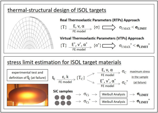 As indicated at the beginning of the paragraph, thermoelastic material properties E, ν and α are usually unknown for most homemade ISOL materials (transition metal or actinide carbides) [26,27]. In this case, the RTPs approach cannot be used for the thermal–structural design of ISOL targets, and an alternative solution was formulated. It is clearly illustrated in Figure 7 and named as the Virtual Thermoelastic Parameters (VTPs) approach. According to it, a set of Virtual Thermoelastic Parameters E*, ν* and α* can be arbitrarily assumed. For the sake of simplicity, in this work, E*, ν* and α* were imposed equal to 102 GPa, 0.1 and 10−6 °C−1, respectively, taking as a reference the order of magnitude of the correspondent SiC material properties. This assumption is surely strong, but reasonable. Indeed, adopting the same E*, ν* and α* values for the design phase and the stress limit estimation (see Figure 7), it is formally correct to compare σI MAX* and σLIMIT* for the structural verification of components.