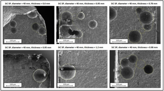 On the other side, SiC SP shows a sensibly lower mechanical strength and is characterized by discrete, non-interconnected pores, which are dispersed in a controlled manner throughout the body of the material [25]. In this case, it was possible to observe for every sample the fracture surface in the proximity of the disc periphery, with the opportunity to highlight the critical flaws originating fracture. Figure 8 presents some SEM (TESCAN, model VEGA 3xmh) images taken on the fracture surface in the proximity of the disc periphery for six different SiC SP samples. Pores are evident and their size confirms the typical values indicated in [25].