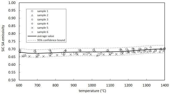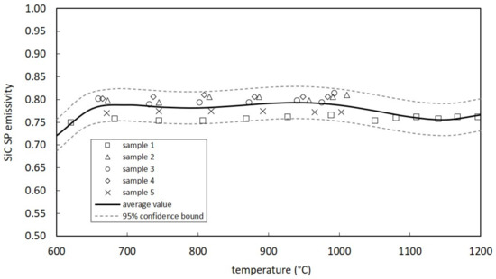 Figure 9 and Figure 10 report the total hemispherical emissivity (ε) data for SiC SA (six samples) and SP (five samples), respectively. With the aim to estimate the average emissivity as a function of temperature for both SiC grades, a one-variable polynomial regression model was adopted [28] using a polynomial of degree 6. Both figures show the average value, calculated according to the best polynomial regression model, with the corresponding 95% confidence intervals, derived by means of the root mean squared error.