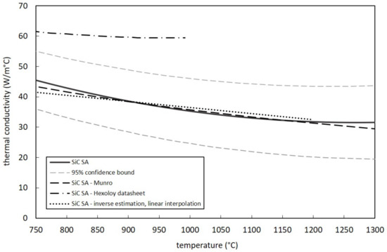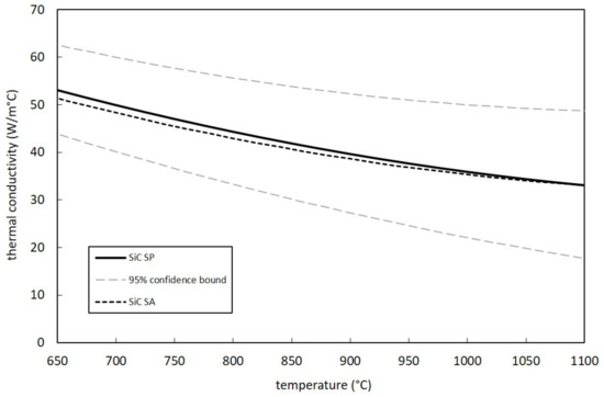Figure 11 and Figure 12 report the thermal conductivity curves for both SiC SA and SP. They were defined by means of Equation (1), taking into consideration the parameters C0, C1 and C2 calculated according to the method proposed in Section 3.2 (see Table 3). In particular, Figure 11 shows the SiC SA thermal conductivity curve with the related 95% confidence bounds. The values estimated in this work are compared with data obtained by Munro [19], Hexoloy datasheets [25] and the linear estimation proposed by Manzolaro et al. [15]. All aforementioned references present a very good agreement with the proposed SiC SA thermal conductivity curve, with the only exception of Hexoloy® datasheets, which clearly overestimate thermal conductivity values up to 1000 °C. All curves were plotted for temperatures between 750 and 1300 °C since all temperature measurements used for thermal conductivity calculation were observed within this range. The SiC SP curve is clearly shown in Figure 12 together with 95% confidence bounds. Additionally, in this case the temperature range was defined taking into consideration the temperature measurements performed on the sample discs. For the sake of comparison, it is possible to also appreciate in the same figure the SiC SA reference curve. Thermal conductivity values for the two SiC grades are practically identical, with differences that tend to zero at the highest temperatures. The similarities in terms of grain size and density evidenced in Table 2 surely help to explain the above mentioned coincidence of SA and SP curves.