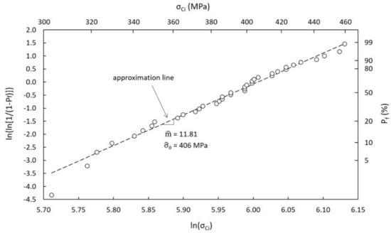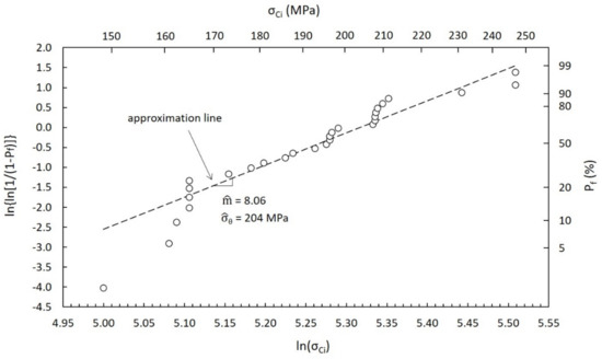 In this paragraph, the main calculation steps followed for the definition of σLIMIT are reported. In particular, Figure 14 and Figure 15 clearly show the most important details of the statistical analyses performed for the estimation of the Weibull distribution parameters according to the ASTM standard practice [24], with Pf being the probability of failure and σCi the critical stress value for the i-th sample. All input data are listed in Table 4 and Table 5 for SiC SA and SiC SP, respectively.